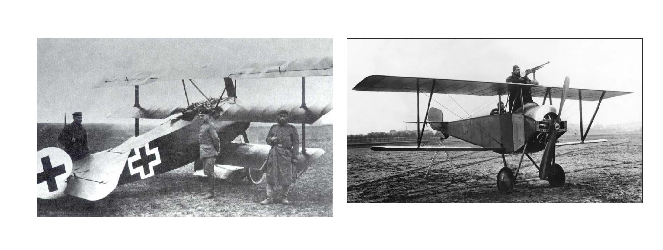 Ci-dessous, un biplan allemand Fokker opposé à un fragile biplan français, peut-être un SPAD S.VII, équipé d’une mitrailleuse synchronisée. La différence de technologie entre ces avions symbolise les défis rencontrés par les pilotes lors de la Première Guerre mondiale.