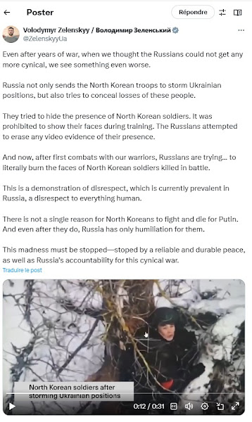 Sur son compte X (@ZelenskyyUa), Volodymyr Zelensky publie une vidéo d’origine russe ou l’on aperçoit des soldats russes qui mettent le feu au visage du cadavre d’un soldat nord-coréen tué. Dans la vidéo complète, des soldats Russes disent face caméra « Dites-lui de mettre un masque, mettez le masque. Allez ! Personne ne les connaît ici de toute façon (dans le sens brûler les visages).«