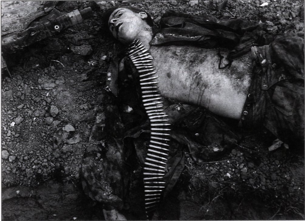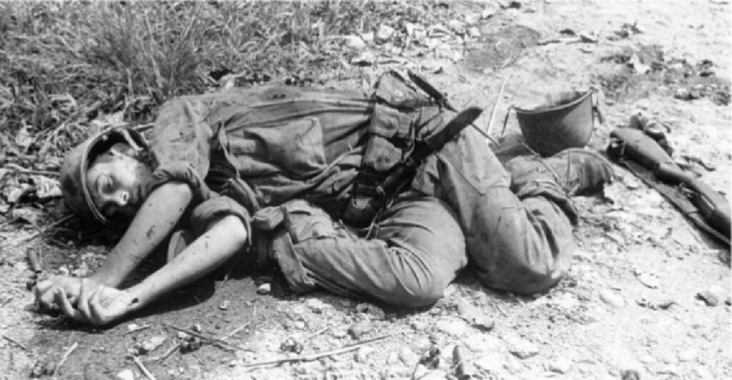 Ce soldat américain du 34e régiment anti-tank a été tué par des tirs de mortier île de Leyte Philippines le 31 Octobre 1944. Cette photographie a été utilisée pour les besoins de la propagande, censurée elle n’a été publiée aux États-Unis que dans les années ’60 pour le devoir de mémoire.