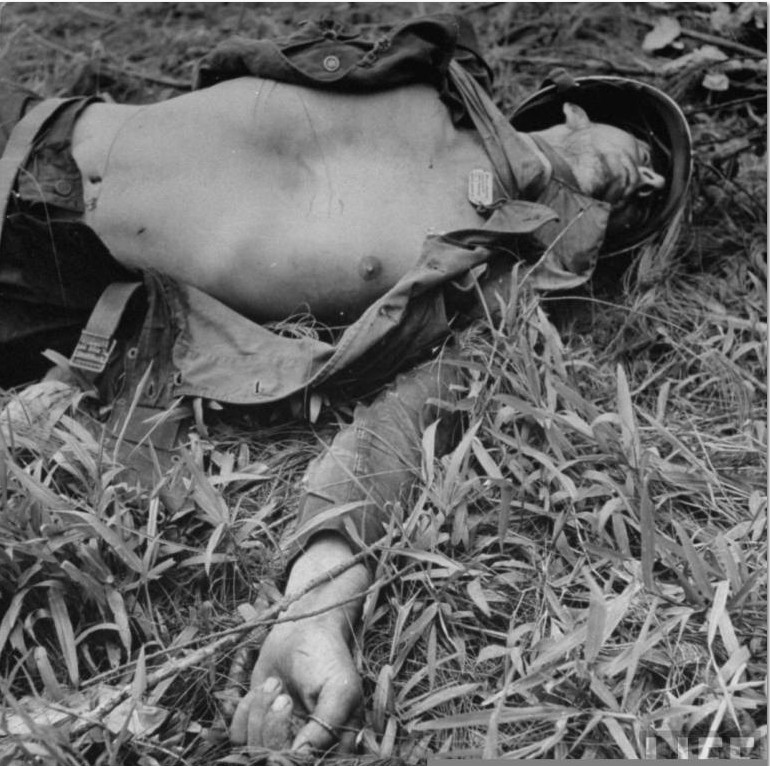 Ce soldat américain a été tué par un sniper japonais après avoir poignardé à mort le soldat japonais visible à l’arrière-plan. La particularité de cette photographie réside dans le fait que les Japonais ont délibérément mis en avant à la fois le corps du soldat américain, en soulignant le poignard qu’il tient encore en main, et celui du soldat japonais à l’arrière-plan. L’objectif était de montrer à la population japonaise la « monstruosité » de ce soldat américain qui venait de tuer leur compatriote combattant pour le Japon.