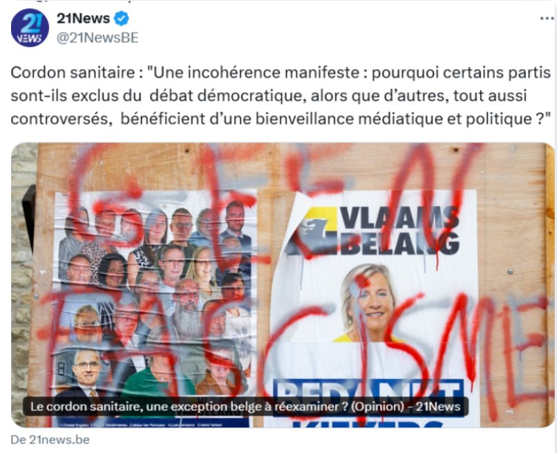 Il n’existe pas de consensus pour l’étendre à d’autres partis, même lorsque ceux-ci suscitent la controverse. À l’extrême gauche, des alliances avec le PTB ou la Team Fouad Ahidar ne soulèvent guère d’objections, malgré des accusations d’antisémitisme, des positions en opposition à la démocratie libérale – fondée sur l’État de droit, la séparation des pouvoirs et la protection des libertés fondamentales –, ou encore un refus de l’État laïque et une volonté d’intégrer la religion dans la sphère publique. Cette situation crée une incohérence manifeste : pourquoi certains partis sont-ils exclus du débat démocratique, alors que d’autres, tout aussi controversés, bénéficient d’une bienveillance médiatique et politique ?