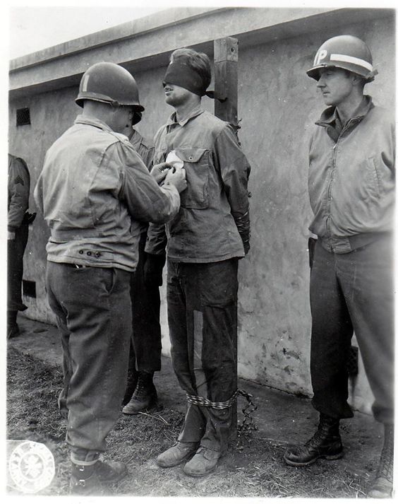 => National WWII Museum : Photos exécutions espions allemands Ardennes 1944 (cible poitrine, inhumation) - US Army Field Manual 27-10 (1940), chap. 4 : Espions en uniforme ennemi exclus POW, jugés par tribunaux militaires, peine de mort légale si loi antérieure conflit.