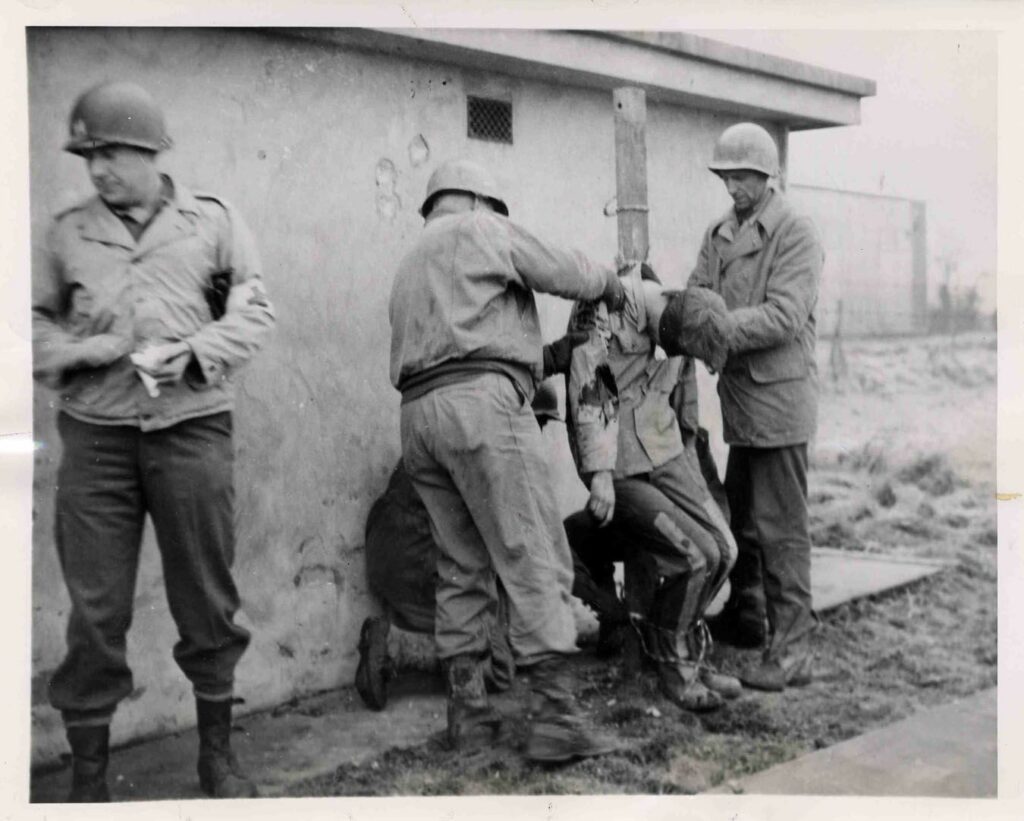 Photographie 1 : Un soldat américain fixe une cible sur la poitrine de l’officier allemand. Cette procédure, standard dans les exécutions par peloton d’exécution, visait à assurer une mort rapide et précise.
