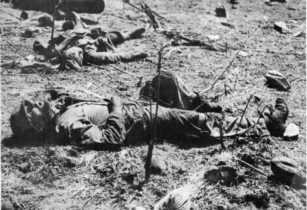 Soldat Américain tué au Japon par un tireur d’élite, à sa gauche le corps d’un soldat Japonais qu’il est parvenu à poignarder