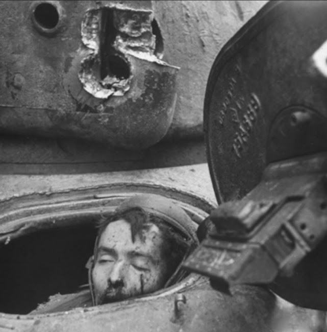Malgré la violence des combats en cours, un soldat Allemand parvient à prendre ce cliché on l’on aperçoit le visage du soldat Américain Julian PATRICK tué dans son char, la pellicule est extraite de l’appareil photo du photographe allemand tué lors de cette opération, elle était destinée à être publiée dans la presse Allemande pour leur propagande nazie anti-américaine.