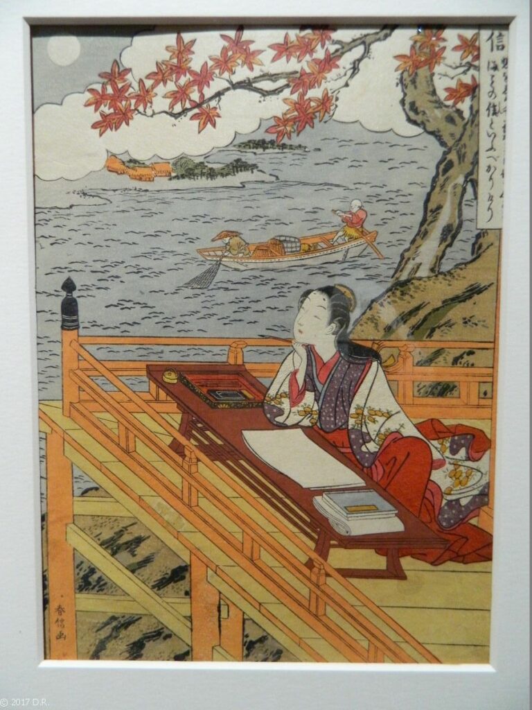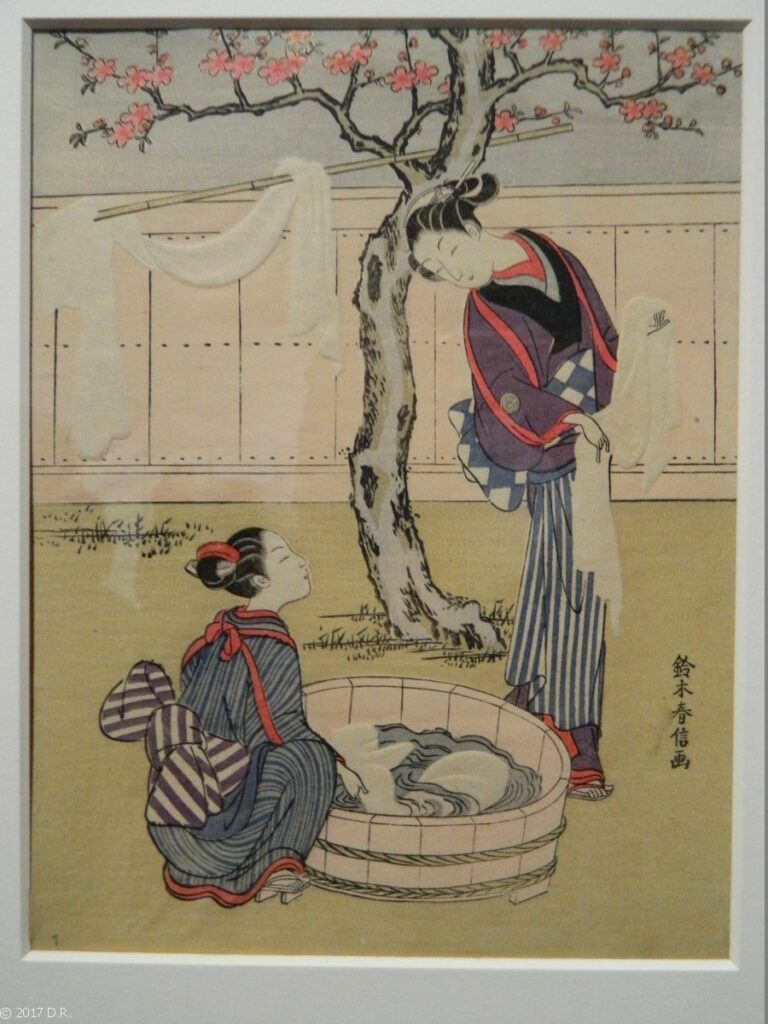 日本画 Entre 1765 et 1770, Harunobu dessine un millier d’estampes qui le consacrent comme le grand maître de son temps. Il tient cette célébrité de sa contribution capitale à une innovation technique : la pleine polychromie (nishiki-e), à l’instigation privée, de la classe intellectuelle fortunée d’Edo.