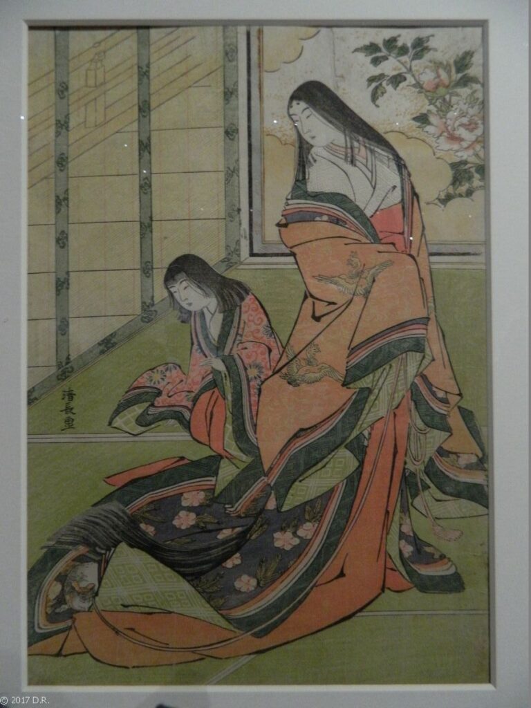 Harunobu illustre le goût pour le passé et pour la littérature niso-japonaise des cercles d’art poétique auxquels il est lié. Il a volontiers recours à la Parodie (mitate), transposant des sujets classiques dans un contexte contemporain.